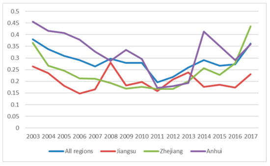 To further analyze the convergence of the urban land-use efficiency of the cities in the Yangtze River Delta urban agglomeration over time, we first calculate the σ convergence index of the Yangtze River Delta urban agglomeration and the three provinces, and the results are shown in Figure 6. It can be seen that the urban land-use efficiency of the Yangtze River Delta urban agglomeration is bounded by 2011, showing a trend of first convergence and then divergence. Similarly, Zhejiang Province also showed a convergent change from 2003 to 2011, while a divergent change from 2011 to 2017. The σ convergence index of urban land use efficiency in Jiangsu Province fluctuates frequently and does not show obvious characteristics of convergence or divergence. The urban land-use efficiency of Anhui Province showed a convergence trend from 2003 to 2011 but had no obvious change trend from 2011 to 2017. A horizontal comparison of the three provinces shows that the σ convergence index of Anhui Province is generally higher than that of the other two provinces, which indicates that the gap of urban land use efficiency within Anhui Province is larger.