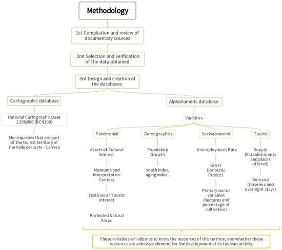 At the methodological level, this study gathers the relevant information related to the tourist, demographic, socioeconomic and heritage activities of the tourist territory Valle del Jerte-La Vera, alphanumerically and cartographically. This information is analyzed through the descriptive method [,,], which allows us to perform the territorial characterization of the area, in order to determine whether its resources serve as a focus of attraction for travelers. As Gómez [] states, “descriptive studies seek to specify the properties, characteristics and important aspects of the phenomenon under analysis”. It should be noted that the use of this methodology was adopted, in order not only to collect information on its characteristics, but also to be able to use these results in subsequent studies.