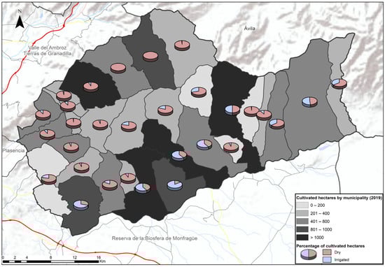 In terms of sectors of activity, the primary sector, specifically agriculture, still plays an important role for the employed population. According to the Socio-Economic Atlas of Extremadura for the year 2021, whose data correspond to the year 2019, a total of 16,168 cultivated hectares are concentrated in this area, of which 10,691 are rainfed and 5477 are irrigated (Figure 5). A more detailed analysis of their distribution by municipality shows that Jaraíz de la Vera, Navaconcejo, Losar de la Vera and Cuacos de Yuste have more than 1000 cultivated hectares, while others, such as Robledillo de la Vera, Gargüera, Viandar de la Vera and Guijo de Santa Bárbara, do not reach 200 hectares. The distribution of dry and irrigated hectares is closely related to the presence of watercourses in the municipalities bordering the territory of the Reserva de la Biosfera de Monfragüe, which results in a greater presence of irrigated cultivated hectares in the southeast of the territory. The most representative crops in Valle del Jerte-La Vera are fruit trees (7864 ha), mainly cherry trees, followed by industrial crops (3565 ha), with pepper for paprika as the main crop, and olive groves (3308 ha).