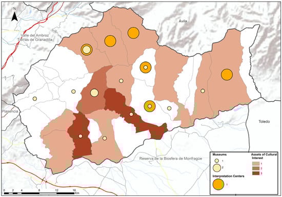 The following map (Figure 6) shows which municipalities in Valle del Jerte-La Vera have the highest number of cultural heritage elements. The area has a total of 19 assets of cultural interest, concentrated in municipalities, such as Cuacos de Yuste and Pasarón de la Vera, while 17 municipalities have none. In addition, the area is home to 15 museums, with Cabezuela del Valle and Garganta la Olla with several museums each, while 17 municipalities have no museums at all. The number of interpretation centers is smaller, with only six in Valle del Jerte-La Vera. Taking these three heritage-related elements into account, 11 of the 30 municipalities do not have any of these typologies.