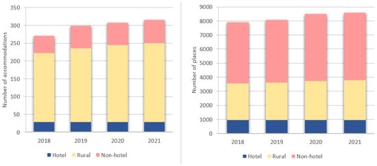 With regard to its evolution during the four years of study, in Valle del Jerte-La Vera, both the number of accommodation establishments and the number of bed places offered have increased (Figure 9). In the case of the number of tourist accommodation establishments, hotel establishments have maintained their numbers throughout the period; equally, there has been a strong growth in rural accommodations, from 193 in 2018 to 209 in 2021, followed by non-hotel accommodations, which has increased progressively from 2018, with a total of 48, to 2021 with 59. This is due to the opening of 17 tourist flats in the area, as hostels and campsites have maintained their numbers. In relation to the number of vacancies offered by these tourist accommodations, the largest number is offered by non-hotel establishments (444)—specifically, tourist flats; this is followed by rural accommodations (244), while the number of vacancies in hotel establishments remains the same.