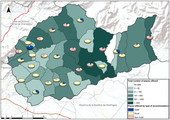 With regard to the number of bed places offered (Figure 11), although the largest number of bed places is of the non-hotel type, by municipality, rural-type bed places predominate. Thus, in 21 municipalities, there is a greater number of bed places offered in rural accommodations. In addition, Valdastillas is particularly noteworthy, with a predominance of hotel accommodations. Overall, the largest number of bed places is concentrated in Jarandilla de la Vera, with 1656, followed by Losar de la Vera with 1101, while 10 municipalities in this area offer less than 50 bed places in their tourist accommodations.