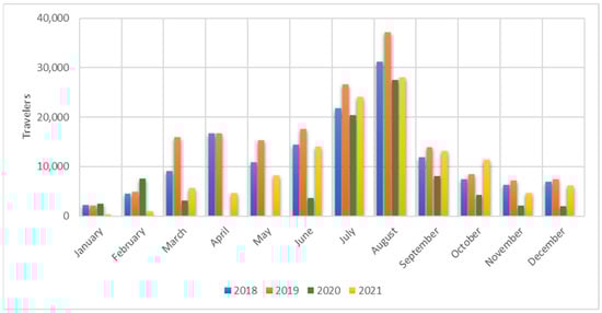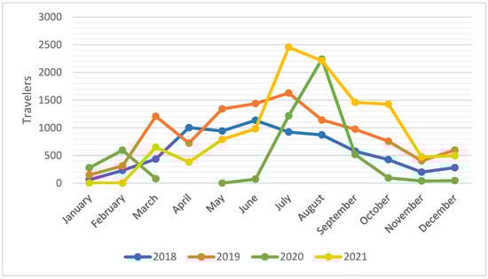 Moreover, the distribution of international travelers does not follow the same pattern as that of national travelers, which is distributed irregularly throughout the year (Figure 13), finding that the maximum value of these travelers also occurs in the summer season (June, July and August). It should be noted that, analyzing the last four years, the maximum number of international travelers was reached in 2021, with values of over 2000 travelers.