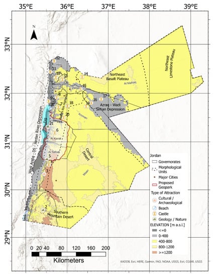 Regarding geological heritage, however, a large percentage is susceptible to human distraction through a range of unsustainable activities, and only a small portion is promoted as tourism sites or products. Some of these geotourism attractions in Jordan and the Middle East were already addressed [], highlighting the missed potential in not growing this tourism sector further, despite large benefits for the countries and motivation of tourists [,,].