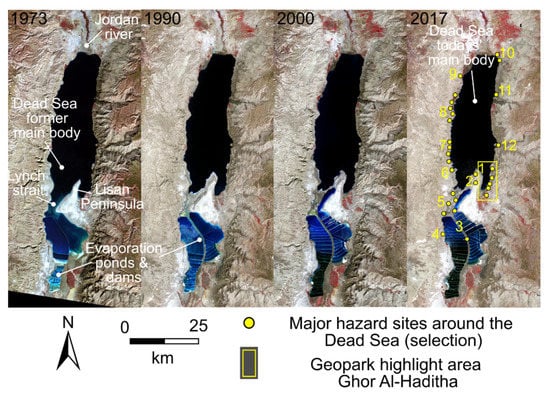 Satellite images of the Dead Sea area. A recession of the shoreline and the separation into a Northern Dead Sea body and the evaporation pond body is clearly visible between 1973 and 2017. Yellow circles mark a selection of the most important sites with known natural hazards such as sinkholes and strong erosion/flash floods on both sides of the Dead Sea, approximate locations are based on [,,]. These are: (1) Ghor Al-Haditha, the highlgiht area of the proposed Geopark; (2) Lisan Peninsula; (3) Arab Potash company and Dead Sea works; (4) Newe Zohar and Ein Boqeq; (5) Lynch Strait; (6) Nahal Zeelim; (7) Ein Gedi to Nahal Hever; (8) Dragot to Mineral Beach, (9) Zikim, (10) Touristic complex Sweimeh, (11) Wadi Ma’in and (12) Wadi Mujib. Landsat satellite images have spatial resolutions of 60 m/px before the year 2000 and 30 m/px thereafter [].
