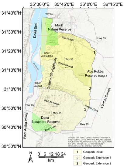 First we thank the three anonymous reviewers for the fruitful comments and suggestions on improving the paper. We would like to thank Artur Agostinho de Abreu e Sá for the encouragement and advice on the conceptualization of a UNESCO Global Geopark in Jordan. We would like to thank Torsten Dahm, Charlotte Krawczyk, Christian Siebert, and Xavier Comas for the support regarding scientific activities. We appreciate the effort of our Jordanian partners at the Ministry of Energy and Mineral Resources, namely the current minister of energy Saleh Al-Kharabsheh, the previous minister Hala Zawati, Amani Alazam, Nedal Atteyat, Ahmad Gharaibeh, Ghada Shatnawi, all secretary generals and all members of the National Geopark Commission. We are grateful for discussions with Hakim Al-Tamimi and William Al Ajalian. Additional thanks go to colleagues Hussam Alrshdan, Robert Watson, Eoghan Holohan and Rena Meyer for helpful comments and suggestions. Finally, we would like to express our gratitude to the UNESCO Jordan commission for their support, effort, and interest regarding the Geopark project.