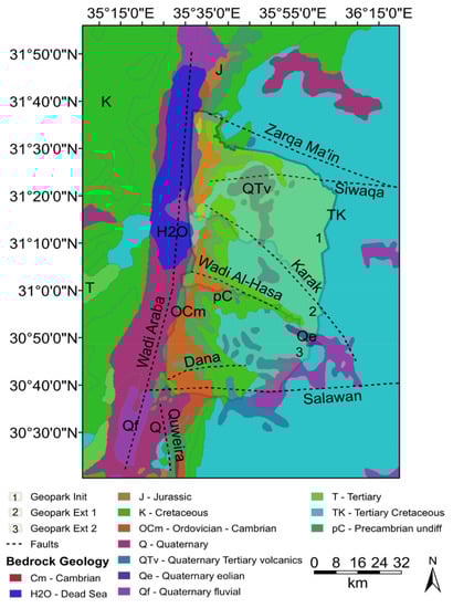 - MEMR Geological Parks By-Law No. 21, 2021. Ministry of Energy and Mineral Resources. Available online: https://www.memr.gov.jo/Ebv4.0/Root_storage/Ar/Eb_list_page/%D9%86%D8%B8%D8%A7%D9%85_%D8%A7%D9%84%D9%85%D8%AD%D9%85%D9%8A%D8%A7%D8%AA_%D8%A7%D9%84%D8%AC%D9%8A%D9%88%D9%84%D9%88%D8%AC%D9%8A%D8%A9_%D8%B1%D9%82%D9%85_(21)_%D9%84%D8%B3%D9%86%D8%A9_2021.pdf (accessed on 9 February 2022).