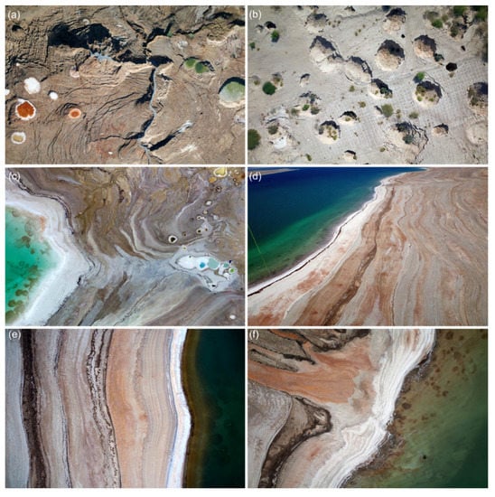 Aerial photos of the Geopark highlight area (G0). These show (a) recent canyons and colourful sinkholes depending on mineral content, (b) deep and nested karst sinkhole features on former agricultural ground, (c) Colourful sinkholes with drainage into the Dead Sea and shallow water salt formations, (d) record of yearly retreating shorelines with different types of evaporites, (e) regression of the Dead Sea with sedimentation and evaporation, and (f) stream-channel discharge systems with offshore salt concretions and submarine springs. All photos were taken by a drone or balloon controlled by Djamil Al-Halbouni, Eoghan Holohan and Robert Watson.