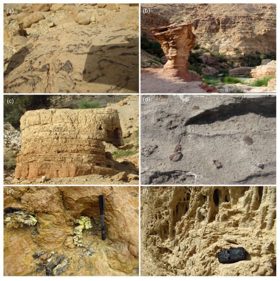 Lime/sandstone formations and fossils: In the Moab mountain areas, the succession of marl, sandstone, and limestone of cretaceous to tertiary age has left a portfolio of various impressive erosive structures through the epochs of water and wind erosion (Figure 8). Fossils (a) are abundant, and especially late Permian plants have been discovered in the Umm Irna sand-siltstone formation near the Dead Sea in the last decades []. Widespread sandstone erosion at the margins of wadis and on top of the mountains form sculpture-like structures (b–d). Moreover, more recent mineralization can be found, e.g., sulphur accumulations (e) and sinter (f).