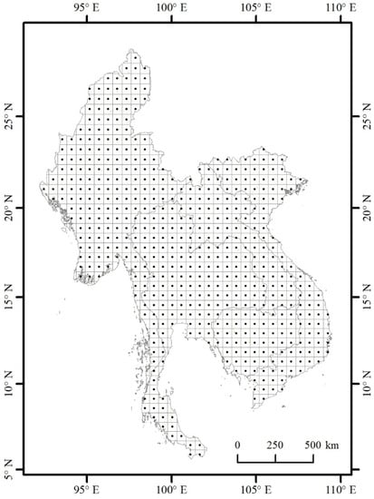 The Indochina Peninsula is located between China and the South Asian subcontinent; it borders China’s Guangxi, Yunnan, and Tibet regions to the north; the Bay of Bengal and the Andaman Sea on the northern edge of the Indian Ocean to the west; Malaysia to the south; and the South China Sea on the western edge of the Pacific Ocean to the east. The area ranges from approximately 92.0 to 109.5° E and 5.5 to 28.5° N. The study area included all the territories of Vietnam, Thailand, Laos, Cambodia, and Myanmar on the Indochina Peninsula, having a total area of 2.065 × 106 km2 (Figure 1).