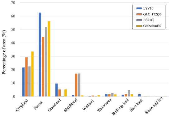 In the four LULC datasets, forest is the land type with the largest area (44.3–63.6%), followed by cropland. The proportion of cropland in the LSV10 and ESRI10 datasets is smaller (21.7–22.4%); the proportion of cropland in the GLC_FCS30 and Globeland30 datasets is larger (29.2–33.6%). In the GLC_FCS30 and Globeland30 datasets, the proportions of grassland are similar (about 5.3%); the proportion of grassland in the LSV10 dataset exceeds 9.3%; and the proportion of grassland in the ESRI10 dataset is only 0.3%. The area of shrubland differed the most among the four LULC datasets (coefficient of variation is 104.4%). The shrubland areas in the GLC_FCS30 and ESRI10 datasets account for a similar proportion (about 17%), while they only account for 1% in the LSV10 dataset, and the least in the Globeland30 dataset (0.7%).