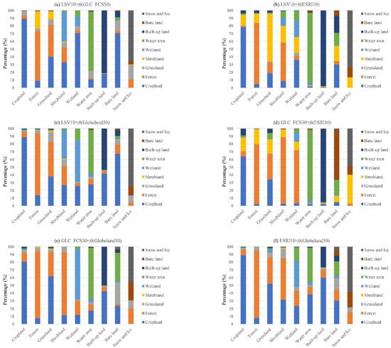 The correct pixel identification of cropland, forest, water area, and built-up land is high; the degree of confusion with other land types is low. The proportion of these land types that were consistent in the pairwise comparison of the multisource LULC datasets is mostly above 70%. Among them, the LSV10/GLC_FCS30 (Figure 4a) and the ESRI10/Globeland30 combinations (Figure 4f) have the highest accuracy of cropland, reaching over 89%. The GLC_FCS30/Globeland30 (Figure 4e) and the ESRI10/Globeland30 combinations (Figure 4f) have the highest forest identification accuracy, reaching over 86%. The LSV10/ESRI10 combination (Figure 4b) and the GLC_FCS30/ESRI10 combination (Figure 4d) have the highest purity degree of water area, reaching over 95%. The LSV10/ESRI10 (Figure 4b) and the GLC_FCS30/ESRI10 combinations (Figure 4d) have the highest identification degree of built-up land, reaching over 97%. Conversely, the pixel identification of grassland, shrubland, and wetland is low; the degree of confusion with other land types is high. The proportion of these land types that were consistent in the pairwise comparison of the multisource LULC datasets is mostly less than 30% and even less than 10%. Among them, the LSV10/Globeland30 combination (Figure 4c) has the highest purity degree of grassland, at 16%; the LSV10/ESRI10 (Figure 4b) and the GLC_FCS30/ESRI10 combinations (Figure 4d) have the lowest purity degree of grassland, at only 1%. The LSV10/ESRI10 combination (Figure 4b) has the highest identification degree of shrubland, at 22%; the GLC_FCS30/Globeland30 combination (Figure 4e) has the lowest, less than 1%. The GLC_FCS30/Globeland30 combination (Figure 4e) has the highest-accuracy identification of wetland, at 66%; the LSV10/GLC_FCS30 combination (Figure 4a) has the lowest, at 13%.