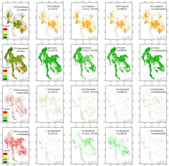 The spatial consistency of shrubland in the Indochina Peninsula (Figure 5p–t) was the worst in the multisource LULC datasets. The amount of shrubland identified in the datasets widely varies, as do the spatial distribution patterns. The GLC_FCS30 and ESRI10 datasets identify the largest shrubland area, reporting similar values. The pixels in the GLC_FCS30 dataset are the densest in the northeast area, followed by the southwest area, and the middle area is sparse. Conversely, the shrubland pixels in the ESRI10 dataset are less distributed in the northeast and southwest regions, and more distributed in the middle. The shrubland area in the LSV10 and Globeland30 datasets is small: Figure 5q,t show that the shrubland distribution is sporadic. From our analysis of the consistency of shrubland identification, we found that 92.85% of the pixels are correctly identified as shrubland by only one LULC dataset, 6.42% of the pixels are identified as shrubland by two LULC datasets, and only 0.06% of the pixels are identified as shrubland by three to four LULC datasets. From a spatial point of view, the shrubland and forest distribution patterns are highly consistent across the datasets, and the grassland and shrubland patterns are generally consistent. Shrubland and grassland are mainly distributed in the low mountain and hilly areas, and distribution relationship with forest and cropland shows a mosaic pattern. Due to the complexity of the spatial distribution, the fragmentation of the spatial form, and the spectral characteristics of the same object with different spectra, we expected the spatial consistency of the above two land types to be low.