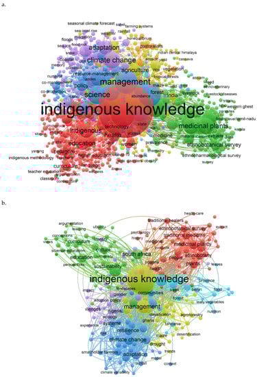 Network visualization map of co-occurring keywords in indigenous knowledge literature—(a) global view, (b) African view, and (c) South African view—published from 1990 to 2020.