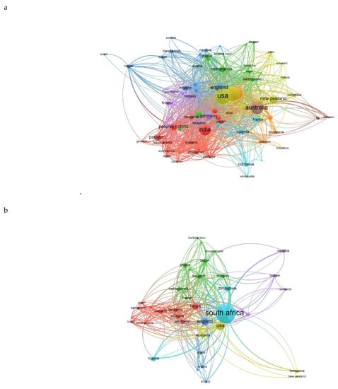Figure 6 shows the countries that are the leaders in producing publications on the concept of IK from a global, African, and South African viewpoint. The IK global analysis identified thirty-eight countries out of ninety-four, showing eight affiliated groups (Figure 6a). While the IK African analysis identified forty-seven countries out of 801, the results show six related groups (Figure 6b). The IK South African analysis identified twenty-five countries out of the seventy-five, showing eight groups (Figure 6c).