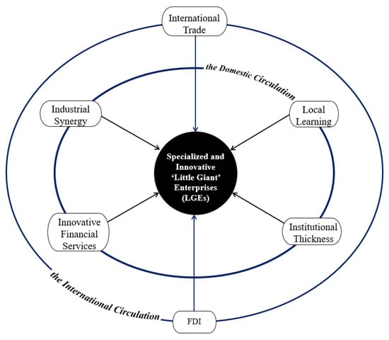 The dual-circulations development pattern provides a new global-local context for China’s SMEs to grow into LGEs. Participating in international circulation, measured as total import and export trade and total foreign direct investment (FDI) [,], can make it feasible for local enterprises to get access to the global market and effectively strengthen cooperation with foreign companies, thus promoting their growth [] and obtaining knowledge spillovers and opportunities for technological transfer to promote their innovation capability [] and competitiveness. Domestic circulation of China owns the advantage in the increasing potential of large and various demand, together with a complete industrial system and perfect supporting conditions. Among them, the cooperation among industry, universities and research institutes [], the coordination of the upstream and downstream parts of industrial chains [], and the combination of scientific and technological innovation, modern finance, and human capital [] are the key factors of the local environment, which SMEs need to rely on to actively participate in international and domestic circulation. In addition, they have to rely upon a conducive institutional, financial and industrial environment, a strong economic foundation, and appropriate traffic and information technology conditions []. The specific framework is shown in Figure 1 as below.