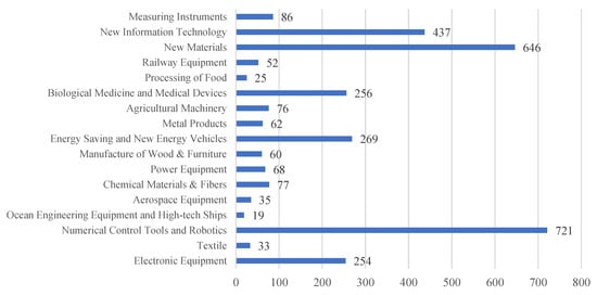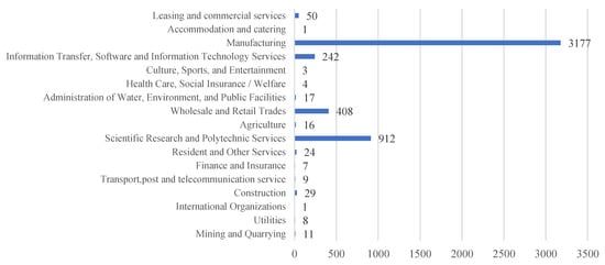 According to the Industrial Classification for National Economic Activities in China (GB/T 4754-2017), the quantity statistics of LGEs in each industry are shown in Figure 3.