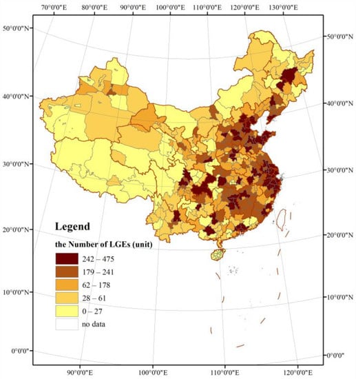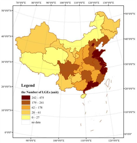 This article visualizes the number of LGEs at the provincial and municipal levels (Figure 5 and Figure 6). At the provincial level, a basic distribution pattern of LGEs is shown, which is greater in the southeast coastal areas and less in the northwest inland areas. LGEs are mainly located in Beijing, Shandong, Jiangsu, Zhejiang, Shanghai, and Guangdong, while they are less distributed in Qinghai, Inner Mongolia, and Xinjiang. At city level, there are generally more LGEs in the southeast region than in the northwest region of China, and there are more LGEs located in the high administrative levels of the cities, especially in the Beijing–Tianjin–Hebei, Yangtze River Delta, Cross–Strait urban agglomeration.