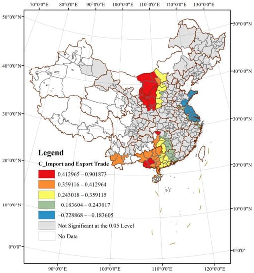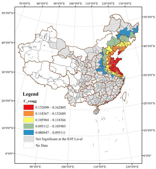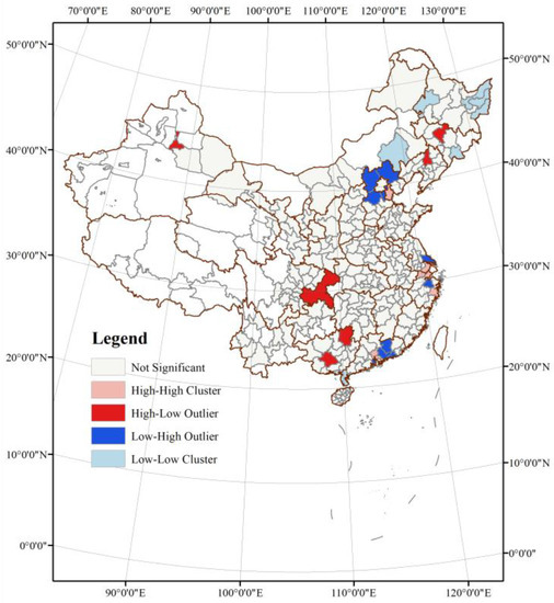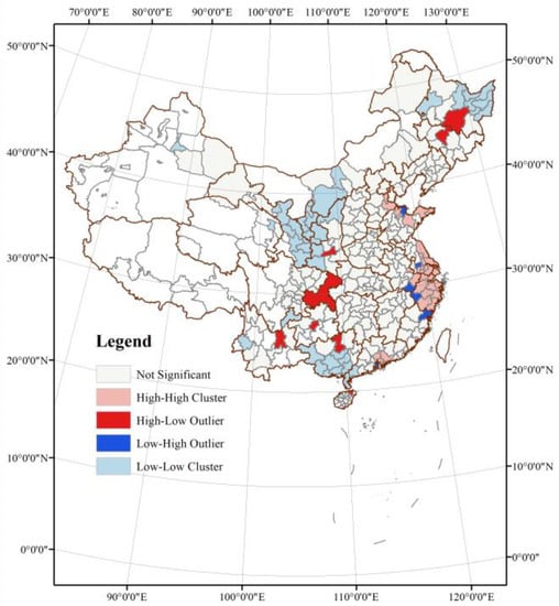 Compared to global Moran’s I, the Anselin local Moran’s I can identify the location and degree of spatial element agglomeration, and distinguish further four types of spatial agglomeration, including (1) high-high cluster (HH), (2) high-low outlier (HL), (3) low-high outlier (LH), and (4) low-low outlier (LL). []. The calculation formula is as follows: