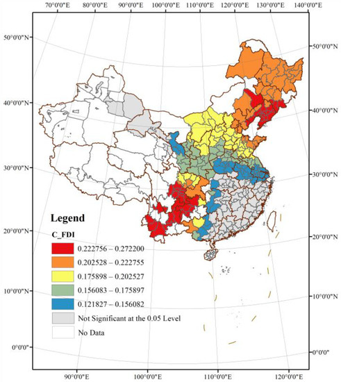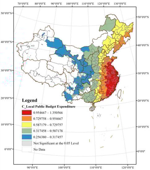The global Moran’s I index of LGEs was 0.147, the Z score was 2.211 < 1.96, and the p value was 0.027 < 0.05, which means that LGEs in manufacturing industry and producer services tend to conglomerate geographically at the city level, which is the precondition of the GWR model.
