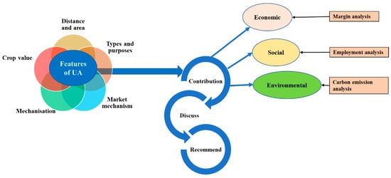 The approach followed in this study is based on a desktop review of fifteen published UA studies, all compared via the governing features identified by Kafle et al. [] as presented in Figure 1. These five key features of UA are: distance and scale (area), mechanisation level, market mechanism, purpose, market mechanism, and crop value. Together, these contribute to the potential for the wider replicability, viability and sustainability of UA. Those features are compared with the contribution towards the specific objectives (i.e., economic, social or environmental), and a discussion on the present status is conducted. Finally, recommendations are provided for the improvement of UA practices.