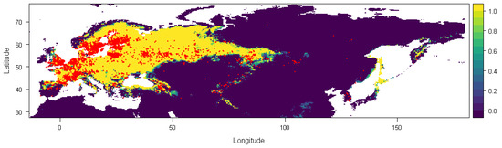 The distribution of the components of the MSPA, according to the results provided by Guidos software, is shown in Figure 3 for the current distribution and in Appendix A.1 and Appendix A.2 for the potential distribution under the different considered scenarios. Comparing these situations, it is found that, in all the cases, the area occupied by cores decreases notably, throughout the study period, especially in peripheral zones, except in the Russian Far East. Simultaneously, there is an increase in the number of islets in southern areas currently occupied by this species and a significantly higher number of bridges.
