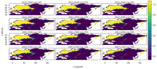 Average prediction of climate habitat suitability maps for Sympetrum flaveolum under future climate scenarios. Average projections are presented for each of four time periods (2021–2040, 2041–2060, 2061–2080, and 2081–2100) and three shared socioeconomic pathways (optimistic—SSP245, middle of the road—SSP370 and worst—SSP585). The probability of occurrence ranges from 0 (dark purple, low probability) to 1 (yellow, highest probability).