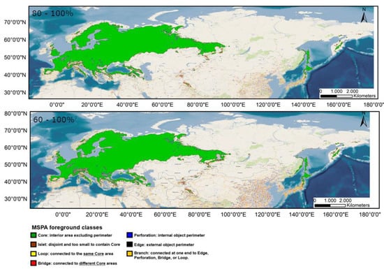 Results of the MSPA analysis for the current situation for distributions 80–100% (up) and 60–100% (down).