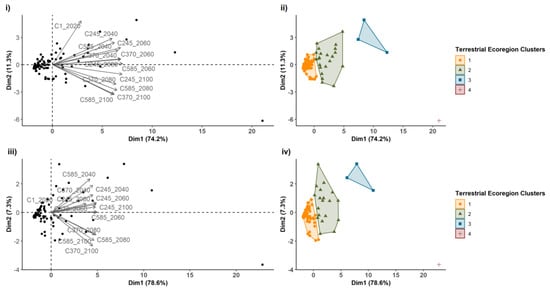 In addition, the PCA revealed an ordination of terrestrial ecoregions according to the different climate change scenarios considered in this study (Figure 4). The two first principal components (dimensions) explained more than 85% of the cumulative variance for both distributions, 60–100% and 80–100% (Figure 4i,ii, respectively). Finally, using the PCA hierarchical classification, we classified the ecoregions into four clusters with similar connectivity across the different scenarios of climate change and by distribution (60–100% Figure 4ii and 60–100% Figure 4iv). Most of the ecoregions were included in clusters 1 and 2 (Figure 4ii,iv; Appendix A.5 and Appendix A.6). However, Alps Conifer and mixed forests were exclusively included in cluster 4 for both distributions (Appendix A.5 and Appendix A.6), having different connectivity (number of links) that other terrestrial ecoregions by the different scenarios of climate change. Cluster 3 also included a few terrestrial ecoregions: Bering Tundra, Scandinavian Montane Birch Forest and Grasslands, and West Siberian Taiga. The tables with the calculation variables for the different clusters can be found in Appendix A.7 and Appendix A.8.