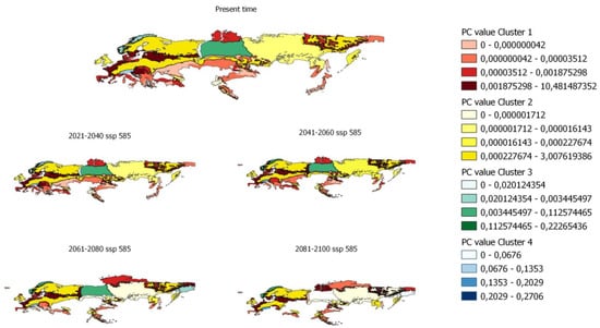 In order to determine the PC index in smaller areas, PC values have been calculated for ecoregions in which there is potential distribution. Figure 5 shows, as an example, the evolution of the PC indices for the ecoregions and the different clusters previously obtained.