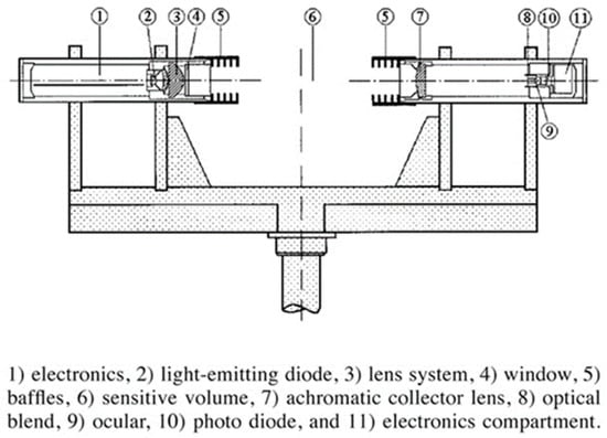 For each minute of the rainfall event, the disdrometer (Figure 3) measures the drop diameter in the range 0.035–0.6 cm. Every drop is separately measured and included in classes having about a 0.005-cm width. The disdrometer shares the diameter range into 128 classes and detects the number of drops that belong to a given class for every raining minute. The passage of the drop in the control volume between two diodes causes a light damping, which allows for measuring the drop diameter (Figure 3). Further details are reported in Carollo et al. [,].