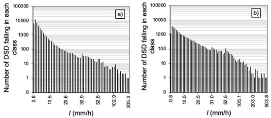 Figure 4 shows that the number of single DSDs within each class decreases as rainfall intensity increases. For the Palermo experimental site (Figure 4a) and I > 85 mm h−1 less than 10, DSDs fall into each class, while for the Sparacia area (Figure 4b), this occurs for I > 125 mm h−1.