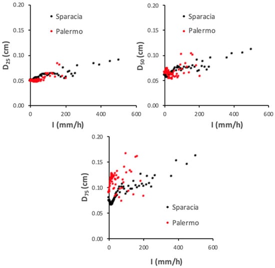 Figure 5 shows the drop diameter Dxx which corresponds to a known percentile xx (25, 50, 75) of the aggregated DSDs related to rainfall intensity. For a given rainfall intensity, the rainfalls detected at Palermo and Sparacia present DSDs characterized by values of D25 and D50 that can be considered overlapped. For the diameter D75 and I < 50 mm h−1, Figure 5 shows that the DSDs registered at Sparacia are characterized by lower values of the characteristic drop diameter compared to Palermo DSDs, while for intensity values higher than about 50 mm h−1, this is less evident.