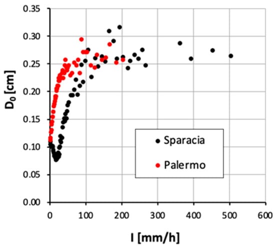 Figure 6 presents the comparison between the pairs (I, D0) measured in the two experimental sites. At the Sparacia experimental area, the median volume diameter shows a decreasing relationship with I for I < 17 mm h−1. Above this value, the relation D0-I is similar to that registered for the Palermo dataset, and for I > 100 mm h−1, the D0 values measured in the two sites can be considered overlapped.