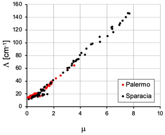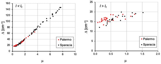 Figure 7 plots the obtained estimates of the μ and Λ parameters of Ulbrich’s distribution. The two parameters are evidently correlated with each other according to the same relation for the two sites. For both sites, some pairs (μ, Λ), characterized by Λ < 20, deviate from the above relation, but, also in this case, the two series are overlapped.