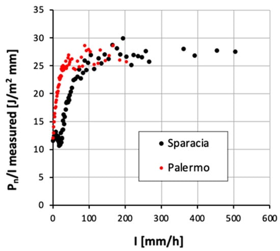 The comparison between the pairs (I, Pn/I) detected at Palermo and Sparacia, plotted in Figure 8, highlights that they are almost overlapped for I > 100 mm h−1, while for I less than 100 mm h−1, the Palermo Pn/I values are higher than the Sparacia ones.