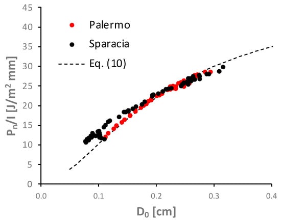 The comparison between the pairs (D0, Pn/I) detected at Palermo and Sparacia is plotted in Figure 10. The pairs (D0, Pn/I) of the two datasets are overlapped for D0 > 0.17 cm and are close to the curve of Equation (10). For D0 < 0.17 cm, Pn/I values measured at the Sparacia site are higher than those measured at Palermo. In other words, for the Sparacia dataset and D0 < 0.17 cm, the application of Equation (10) implies an appreciable systematic underestimation of Pn/I.