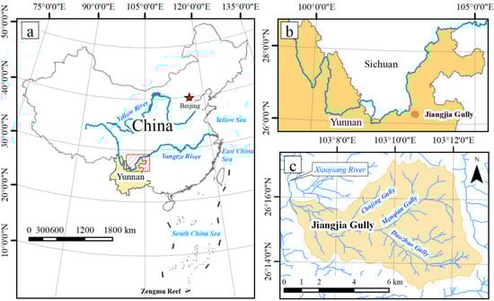 Location of the JJG. (a) Location of Northeast Yunnan in China; (b) JJG’s location in Northeast Yunnan. (c) JJG watershed and its main river network.