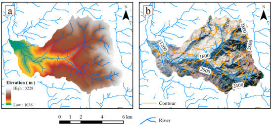 DEM data and remote sensing image data are important resources for our research. Among them, DEM data come from the Advanced Land Observing Satellite (ALOS). ALOS is Japan’s Earth observation satellite, and has three sensors. The Panchromatic Remote-sensing Instrument for Stereo Mapping (PRISM) [] of ALOS is mainly used for digital elevation mapping; the Advanced Visible and Near Infrared Radiometer type 2 (AVNIR-2) [] can be used for accurate land observation; and the Phased-Array Synthetic-Aperture Radar (PALSAR) [] is used for all-weather and all-time observation. PALSAR is not affected by clouds, weather and day and night, and can observe the earth all day. With a high resolution, it can obtain a wider ground view than ordinary SAR. At the same time, PALSAR can be used to generate digital elevation model (DEM) data and monitor specific areas. Now, the 12.5 m resolution ALOS PALSAR DEM data can be downloaded from NASA’s EOSDIS website []. During the research of this study, we downloaded the DEM data of the JJG (Figure 2a). As shown in Figure 2a, the JJG is higher in the east, with an altitude of 3228 m, and lower in the west (1036 m). The eastern area of the whole JJG watershed is wider than the western area. The watershed looks like a lying gourd-like ladle, with the mountainous area in the east of the watershed being the main catchment area.