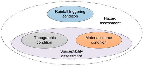 Relationships of rainfall excitation conditions, topographic conditions and material source conditions in debris flow susceptibility and hazard assessment. When only susceptibility assessment is conducted, topographic and material source conditions are the main control factors, while the impact of the rainfall triggering factor should be considered when conducting the debris flow hazard assessment [].