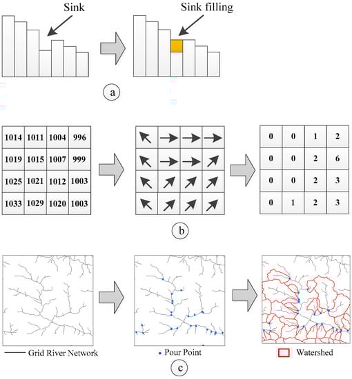 - Generation of the sink filling raster image. A sink is a cell that is surrounded by higher value grids in a raster []. “Fill” is usually the first step of hydrological analysis. It can help to remove small imperfections in the data by changing the pixel value of a sink to the lowest pixel value around it [] (Figure 4a).