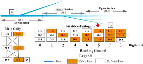 “Three-section method (TSM)” of debris flow gully classification. (a) Three sections of one gully, including U-S, M-S and D-S; (b) Debris flows in different sections of the first-level sub-gully; (c) Debris flows in different sections of the main gully. Some sections of gullies where debris flows occur are marked in brown. Considering the occurrences of debris flows at different locations in the gullies, eight combinations can be obtained.