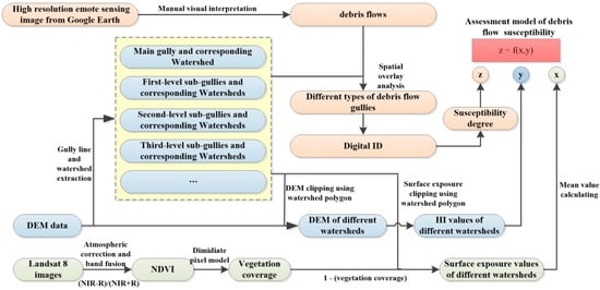 The formation of debris flow must meet the following three important conditions []: (1) The existence of a large amount of loose solid materials (source) that are stored in a watershed; (2) an area with high mountains, steep slopes, and large longitudinal slopes with trenches (topographic conditions); and (3) the presence of enough water sources and catchment power areas (water source conditions). It can be seen that the rainfall factor, topographic condition factor, and material source condition factor are the key disaster-causing factors for the formation of debris flows. Nowadays, the assessment methods for determining debris flow susceptibility and hazard are relatively similar; these include logistic regression modeling [], the Bayesian network [], the support vector machine [], artificial neural networks [], etc., and the differences between them are more reflected in the selection of factors. Considering that rainfall is considered to be the triggering condition of debris flows, the hazard assessment of debris flows can be carried out together with terrain condition factors and material source condition factors; meanwhile, without considering rainfall, the terrain condition factors and material source condition factors could be used to evaluate the susceptibility of debris flow disasters [,] (Figure 3).
