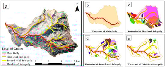 Division of main and sub-gullies in JJG and their confluence areas. (a) Main and sub-gullies; (b) Confluence area of the main gully; (c) Confluence area of the first-level sub-gully; (d) Confluence area of the second-level sub-gully; (e) Confluence area of the third-level sub-gully. The JJG includes 1 main gully, 21 first-level gullies, 21 second-level gullies and 3 third-level gullies.