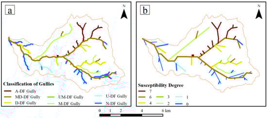Gully classification and different susceptibility degrees. (a) Overlay display of the different gully levels and their classification; (b) Susceptibility degree topological diagram of debris flow gullies. We have not obtained UD-DF gullies (Digital ID = 5) in the JJG, but only seven of the eight categories were successfully interpreted.