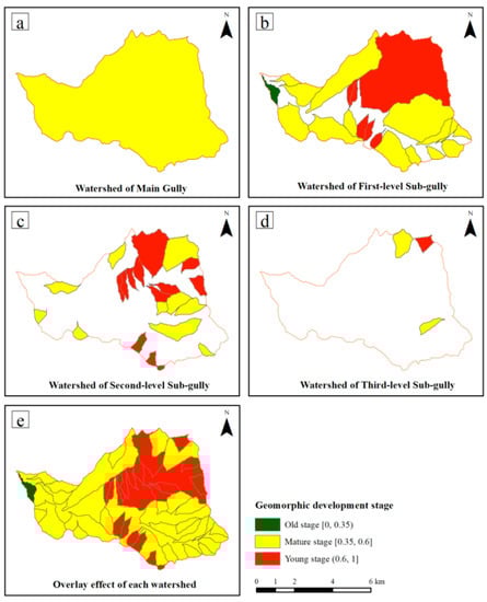 HI values of the different watershed levels. (a) Watershed of the main gully; (b) Watershed of the first-level sub-gully; (c) Watershed of the second-level sub-gully; (d) Watershed of the third-level sub-gully; (e) Overlay effect of each watershed.