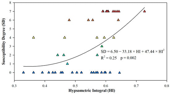 Relationships between HIs and SDs. HIs represent the geomorphic development status of gullies, which are calculated quantitative values. SDs are the susceptibility level defined by us, which can be considered as semi-quantitative values. We use different colors to distinguish different types of debris flow gullies. According to the regression equation, with the increase in HIs, the SDs of debris flow gullies show an increasing trend, indicating that the gully is more likely to suffer from debris flows. The R2 of the fitting model of HIs and SDs is 0.25, and p is 0.002. The formula in the figure is only a result that we try to fit. Since there are no continuous values on the axes, it is not ruled out that there is a better fitting equation.