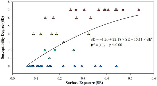 In order to verify the validity of the model construction method, we used 70% of the data to rebuild the model, and the remaining 30% of the data as the validation data, and obtained the new model (SD = −11.4126 + 30.6035 × SE + 37.6692 × HI − 30.906 × SE2 − 20.2534 × HI2, R2 = 0.6219, p < 0.0001). We substituted the validation data into this model. If the calculated result was equal to or close to the defined SD value, the identification was considered valid. After calculation, the effective rate of identification reached 57%. Considering the different quantities of data, the models built were also different. In addition, the regional differences in the geographical environment was also considered []. Therefore, when the above susceptibility degree calculation model was used in practice, it was better to conduct resampling training to generate a local susceptibility calculation model. We also needed to realize that the use of such models is only applicable to the rapid and simple identification of the debris flow susceptibility degree and the debris flow gully type approximately.
