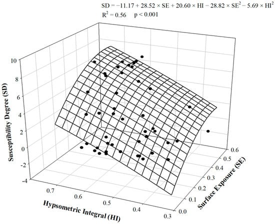 With the help of statistical software, we try to build a surface (Figure 15) to fit these three-dimensional points, and obtain the corresponding mathematical model (SD = −11.17 + 28.52 × SE + 20.60 × HI − 28.82 × SE2 − 5.69 × HI2). In the valley with low SEs and low HIs, there is basically no debris flow, while in the valley with high SE and high HI values, there is an A-DF debris flow gully. Comparing the better goodness-of-fit (R2 = 0.56), it could be found that the goodness-of-fit obtained by using HIs and SEs at the same time is better than that obtained by using only one factor (R2 is 0.25 and 0.37, respectively). This shows that the debris flow is the result of the interaction of many factors. We also need to recognize that the R2 value of the model is 0.56, which still has the possibility of further improvement.