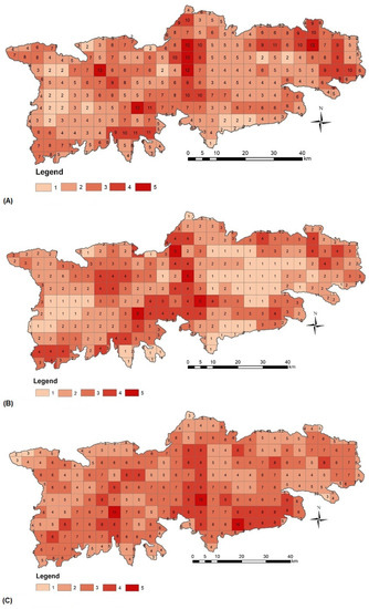 The counting of the occurrences in each grid square for each sub-index was carried out using the “multiparts” technique; geometries with the same attribute were counted only once, regardless of whether they appeared in more than one polygon [20]. This is the most common method used in studies.